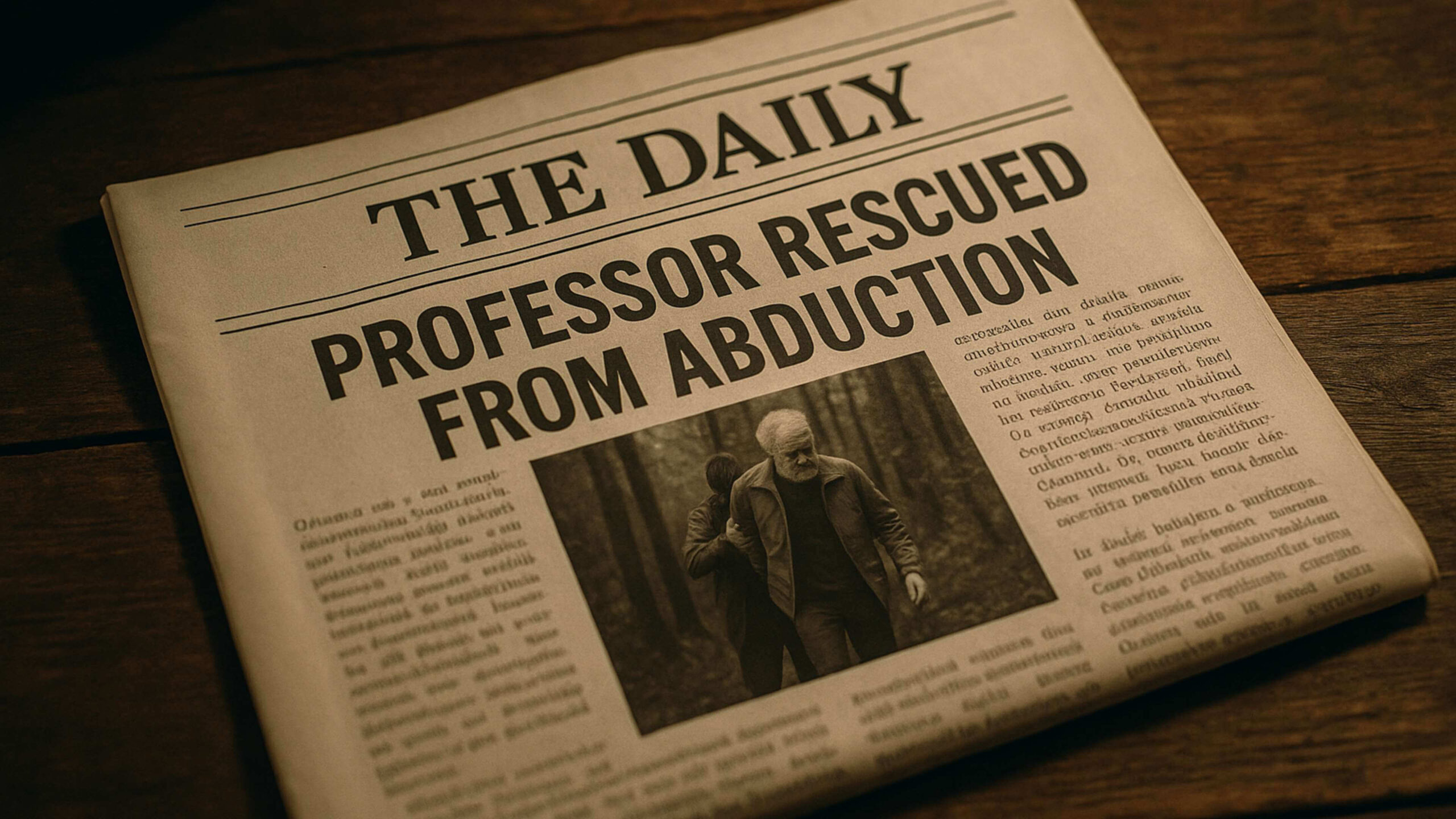 Nachdem ihr die Spuren des Professors bis zu einem alten, verlassenen Campingplatz verfolgt habt, stößt ihr auf eine einsame Waldhütte. Durch die Fenster erkennt ihr: Prof. Dr. Ebrimos lebt – doch er ist gefesselt, geknebelt und in Lebensgefahr. Die Entführer könnten jeden Moment zurückkehren.